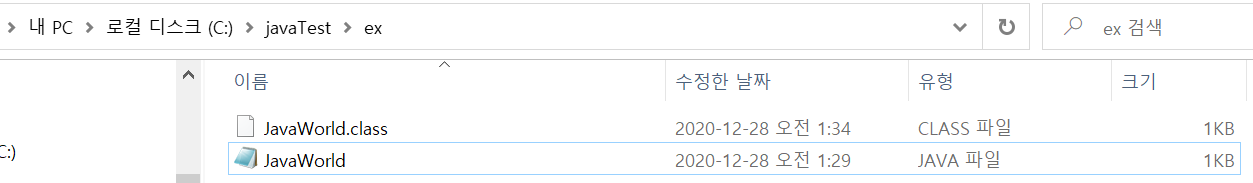 java.exe JavaWorld.java[메모장에작성한java파일명.java] 입력