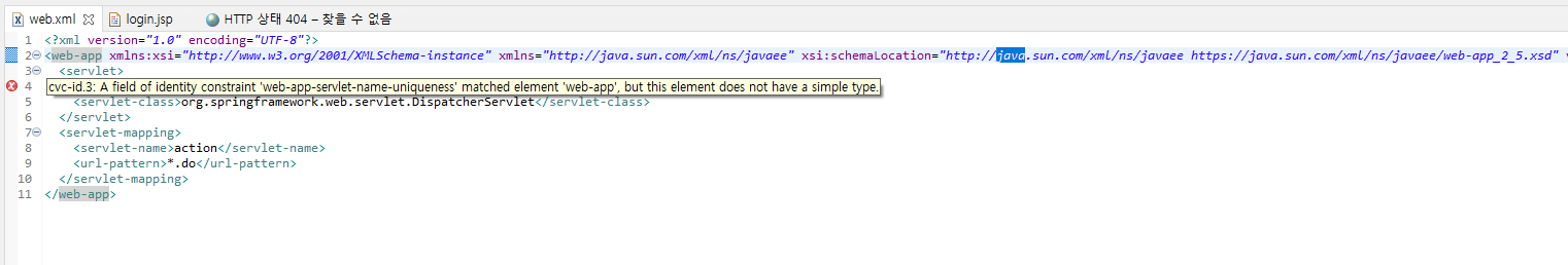 web.xml 에러_cvc-id.3: A field of identity constraint 'web-app-servlet-name-uniqueness' matched element 'web-app', but this element does not have a simple type.