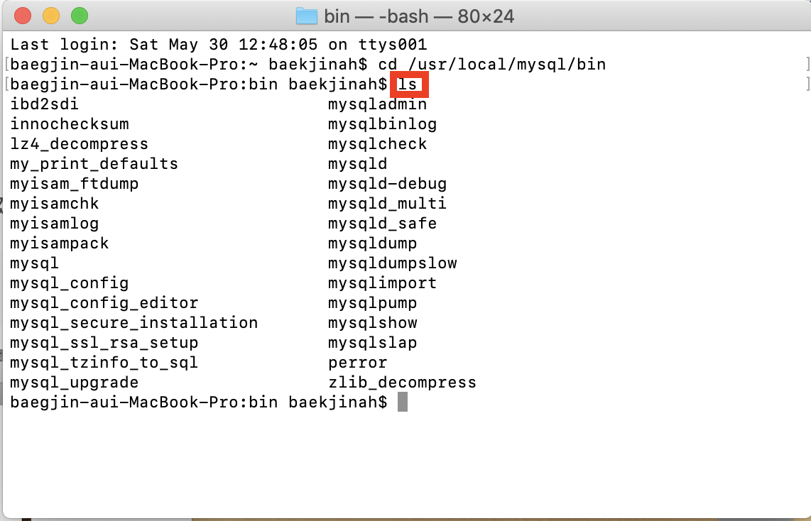 13. 이번에 터미널에서 바로 MySQL을 실행하는 방법을 알아볼껀데요.일단 터미널을 키고 아래와 같이 MySQL bin폴더로 진입합니다.