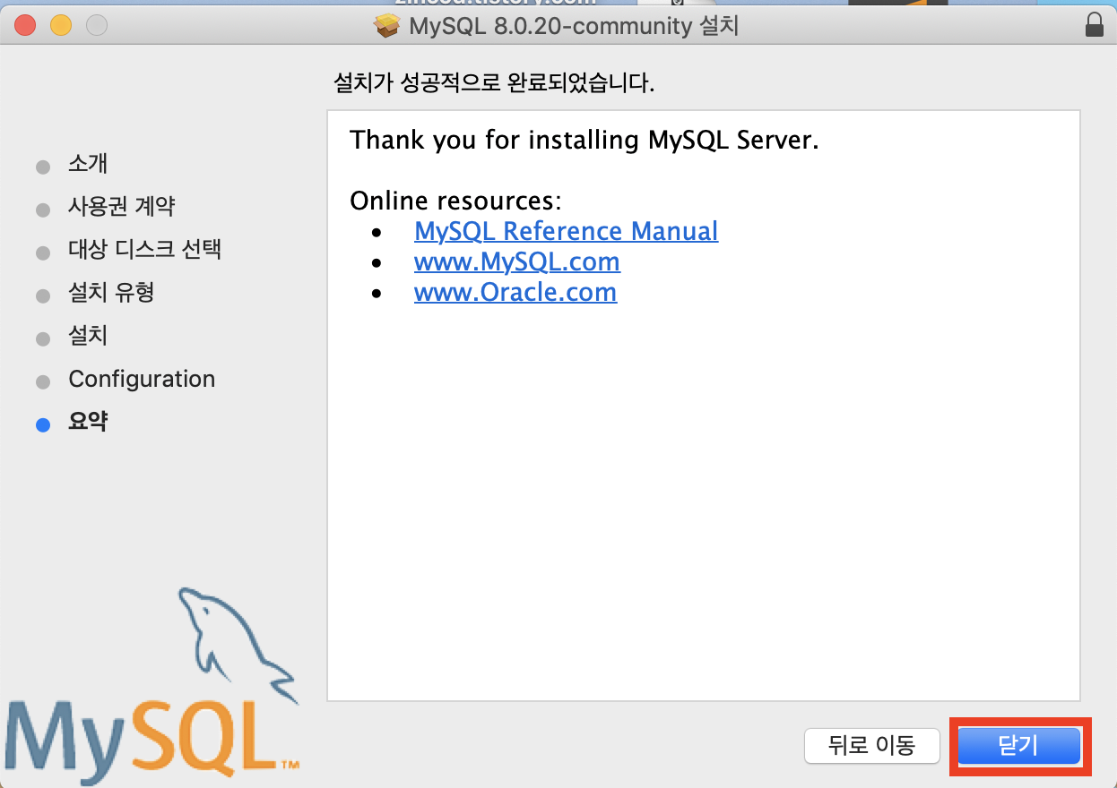 12. 설치된 MySQL이 아래와 같이 잘 실행되는지 확인 후 ,창을 닫아줍니다.