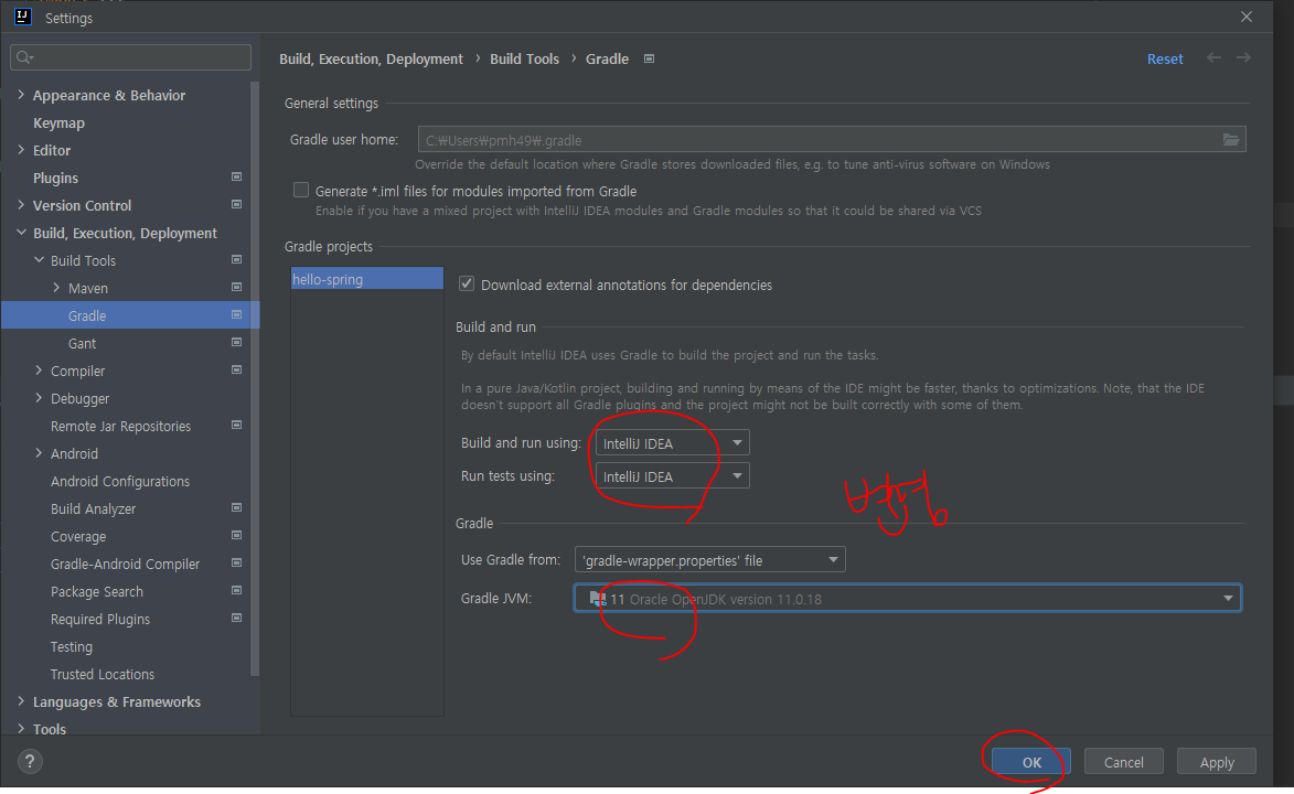 File - Settings - Gradle 선택 후 아래와 같이 설정 변경