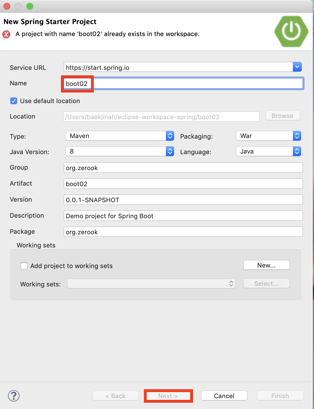 (저는 'boot02'프로젝트를 생성 후에 캡처를 진행해서 오류가 난 것 처럼 보이지만 무시하시고 진행해주세요.)