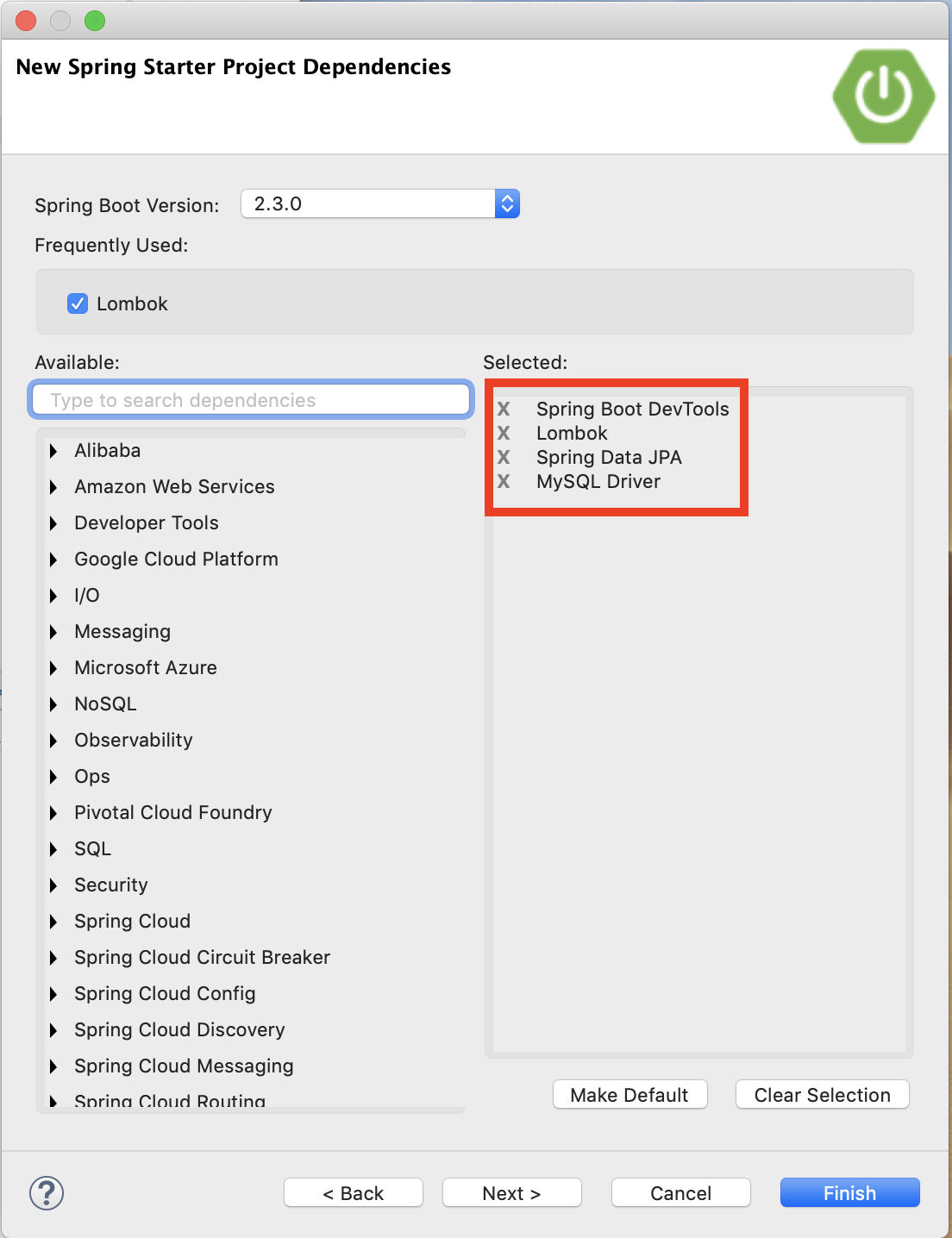 1-4. 아래와 같이 'Spring Boot DevTools', 'Lombok', 'Spring Data JPA', 'MySQL Driver'를 체크하고