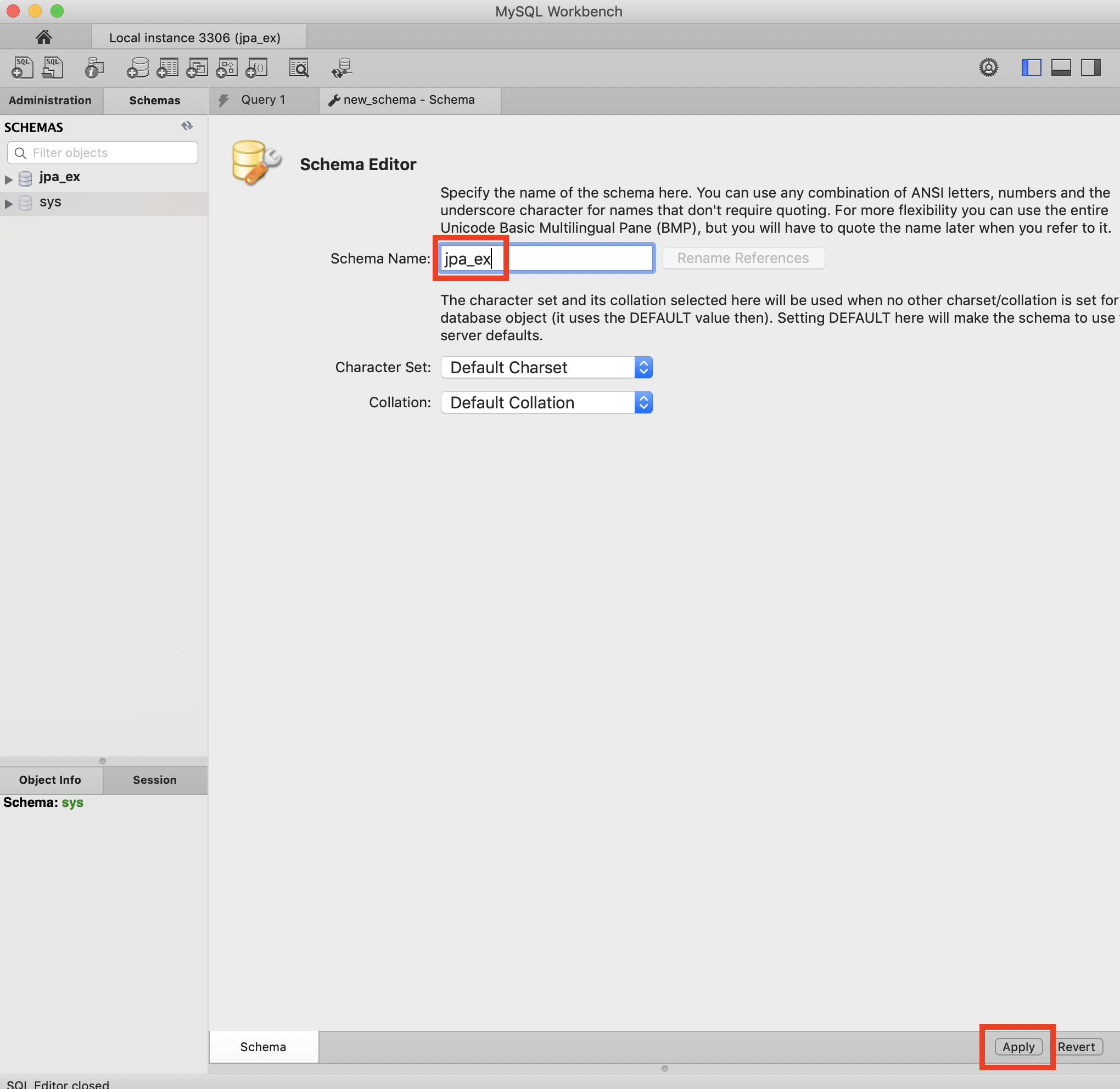 2-3. 스키마 이름은 'jpa_ex'로 하고 'Apply'버튼을 클릭하여 줍니다.