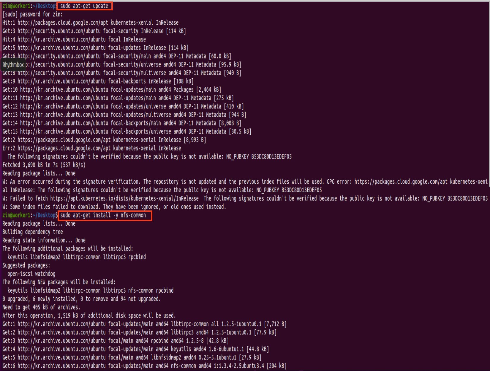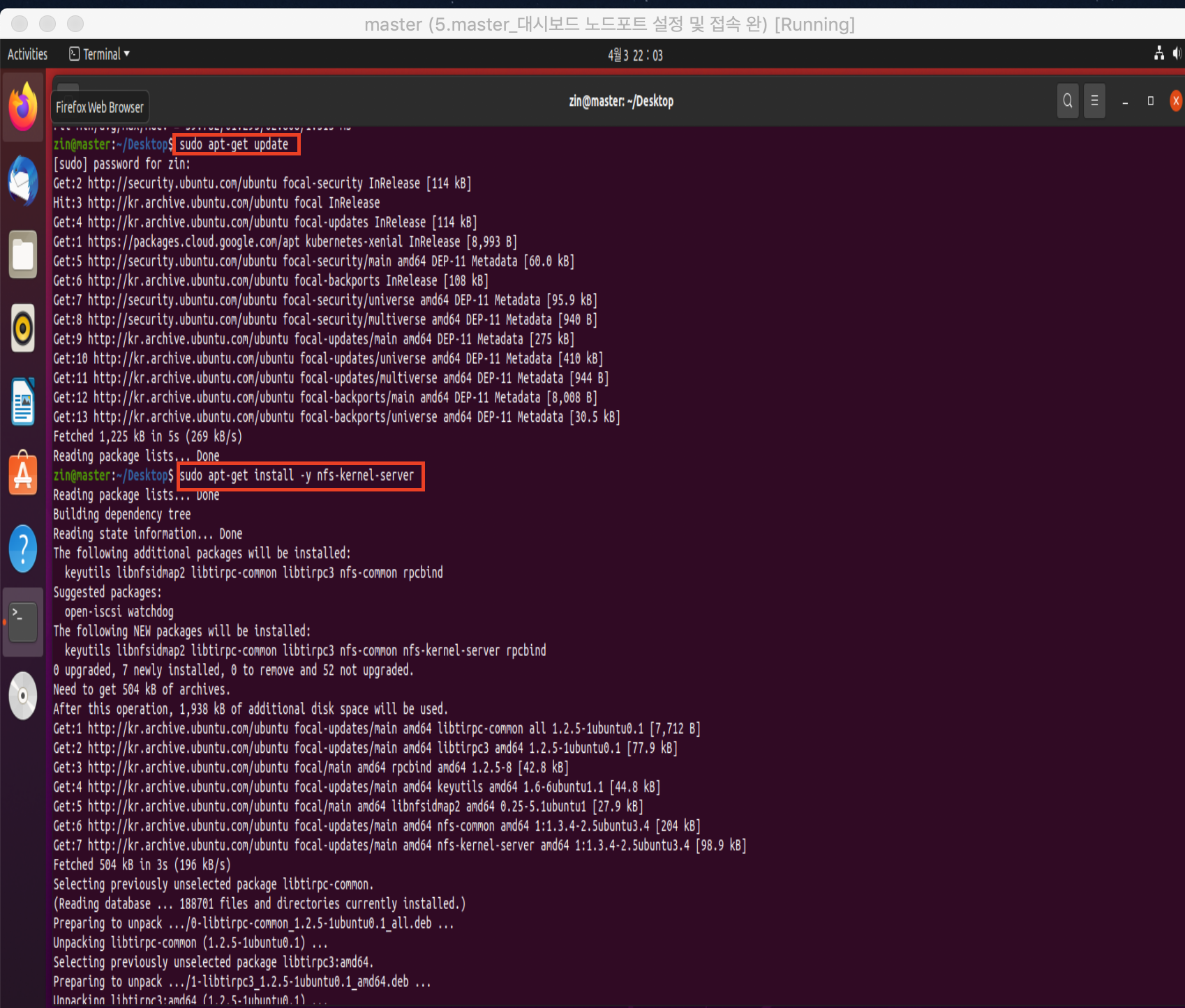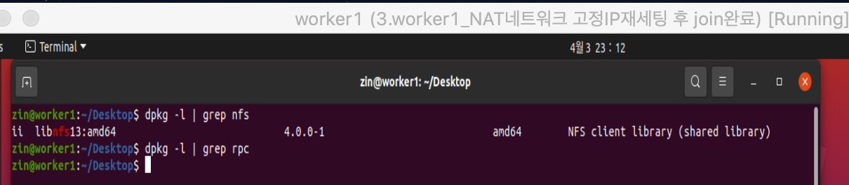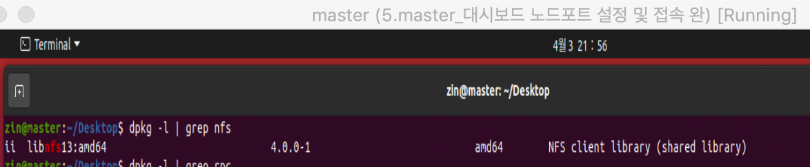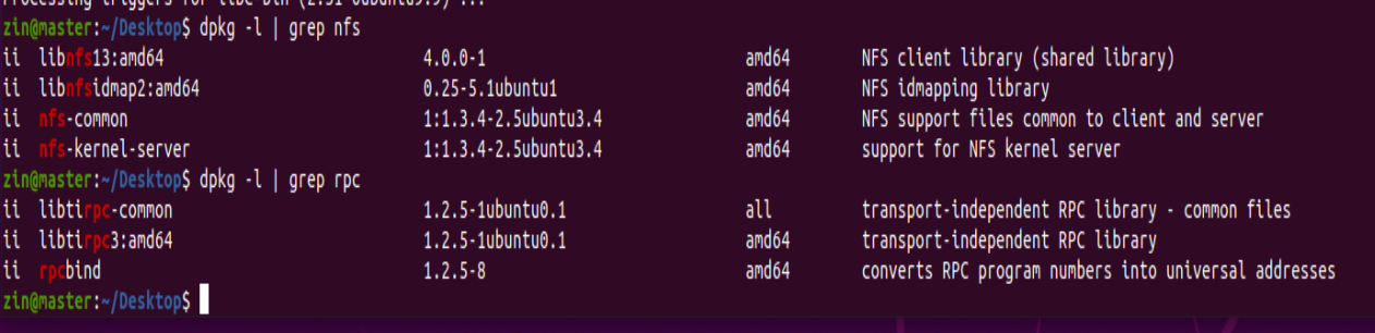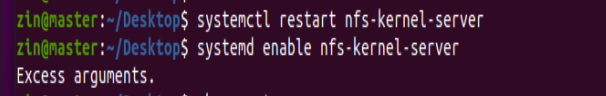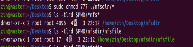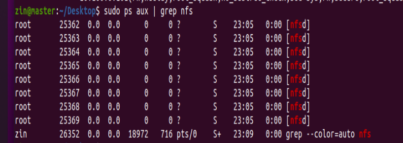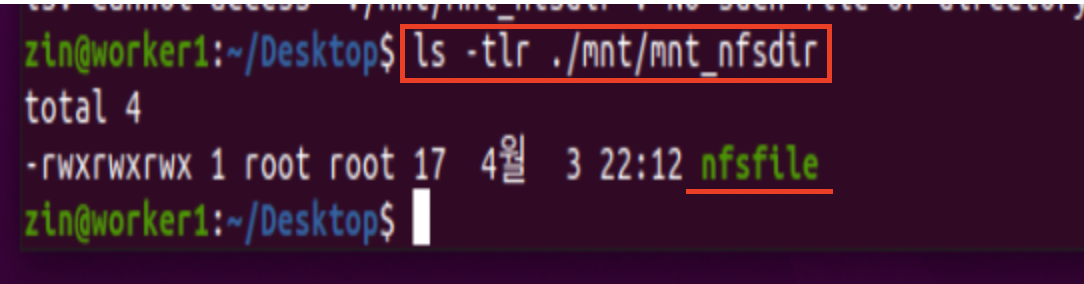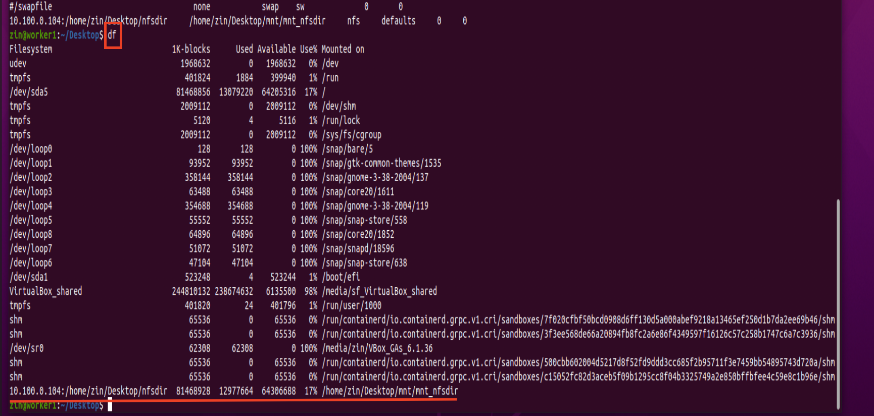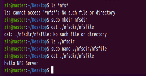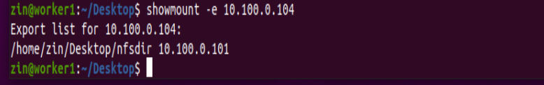 $ sudo mount -t nfs 10.100.0.104:/home/zin/Desktop/nfsdir /home/zin/Desktop/mnt/mnt_nfsdir