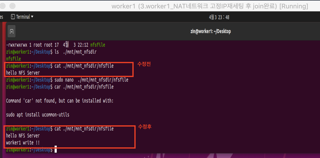 6. worker1에서 './mnt/mnt_nfsdir' 내 파일 수정 후 master './nfsdir/nfsfile' 확인