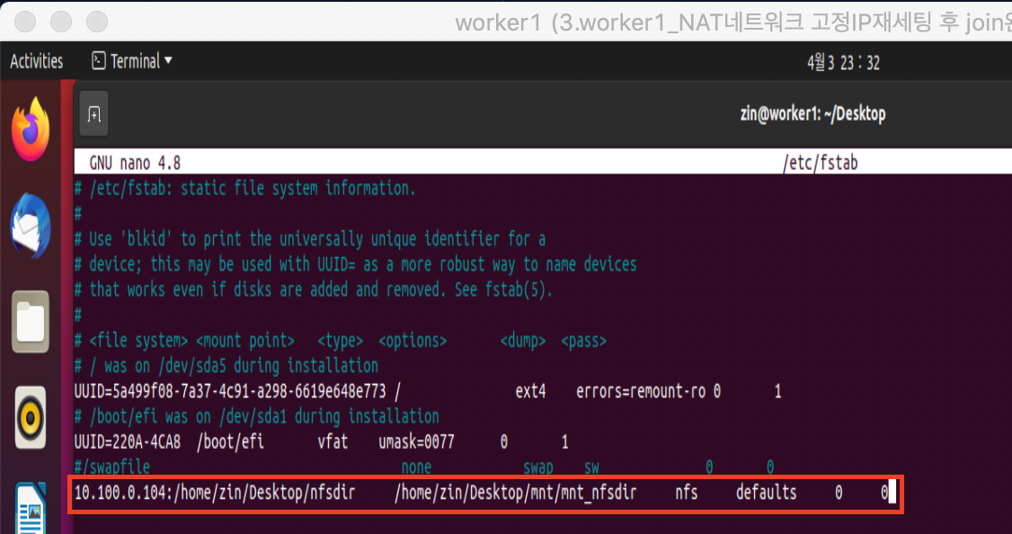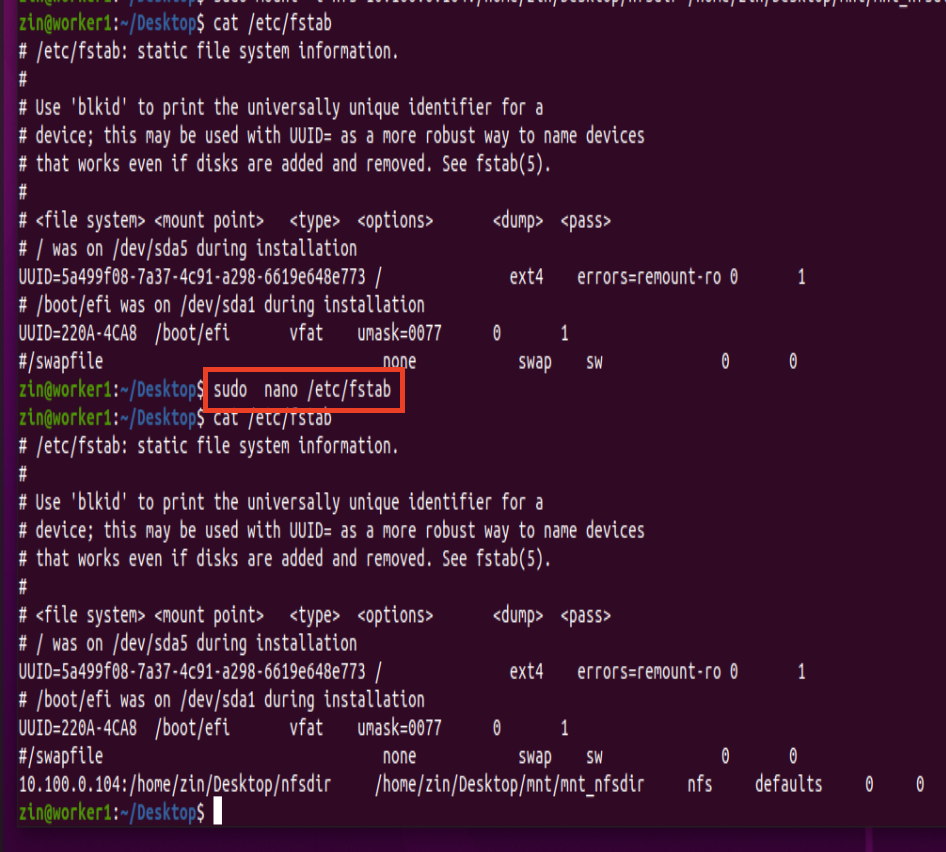 10.100.0.104:/home/zin/Desktop/nfsdir /home/zin/Desktop/mnt/mnt_nfsdir nfs defaults 0 0