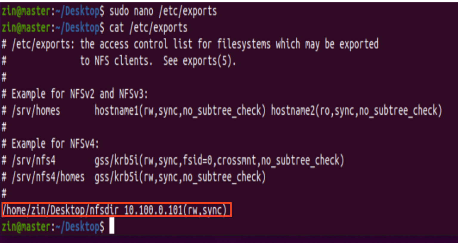 /home/zin/Desktop/nfsdir 10.100.0.101(rw,sync