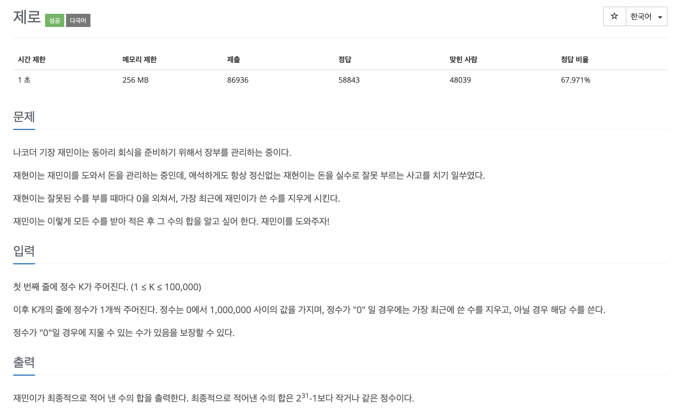 * 이후 K개의 줄에 정수가 1개씩 주어진다. 정수는 0에서 1,000,000 사이의 값을 가지며, 정수가 "0" 일 경우에는 가장 최근에 쓴 수를 지우고, 아닐 경우 해당 수를 쓴다.