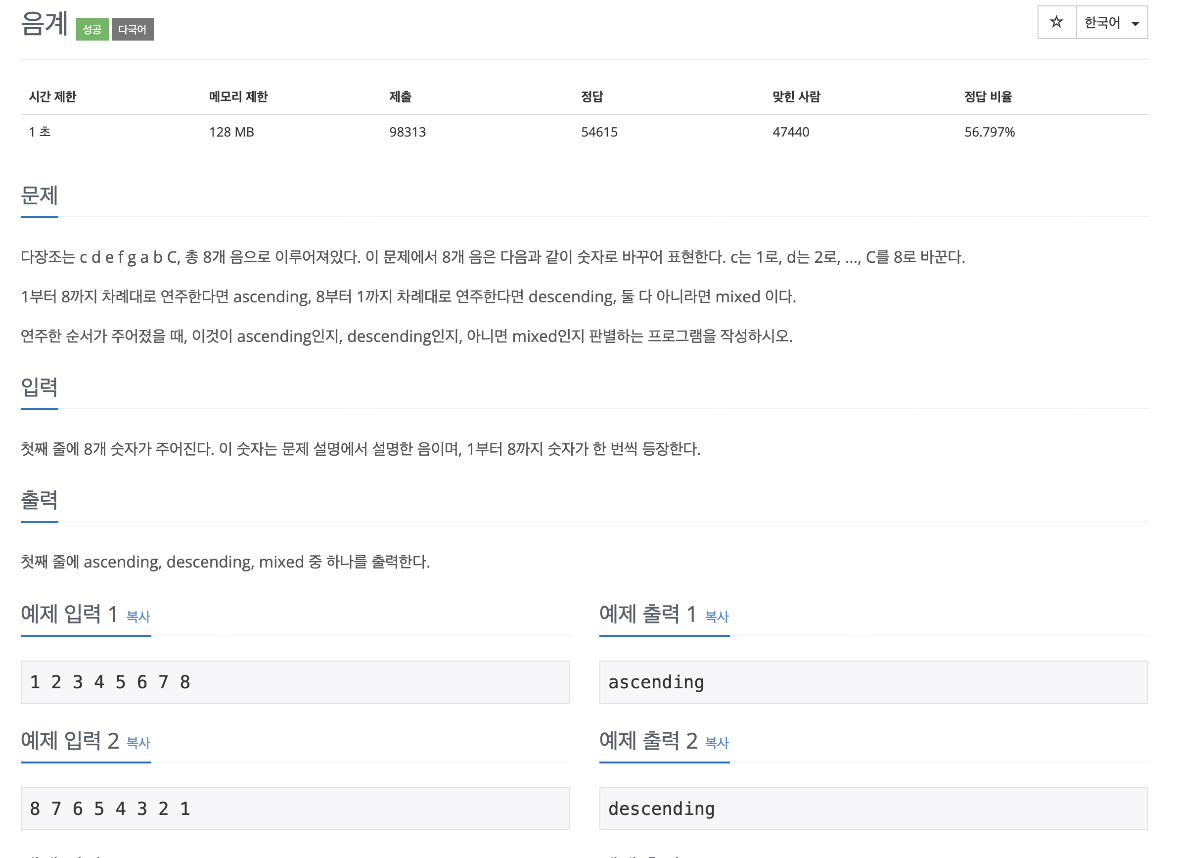 * 1부터 8까지 차례대로 연주한다면 ascending, 8부터 1까지 차례대로 연주한다면 descending, 둘 다 아니라면 mixed 이다.