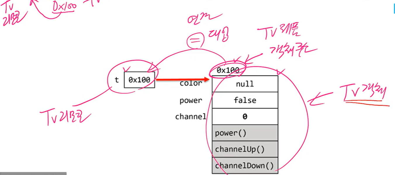 그 다음에는 대입연산자(=)에 의해서 생성된 객체의 주소값이 참조변수 t에 저장됨. 이제는 참조변수 t를 통해 Tv인스턴스에 접근할 수 있음